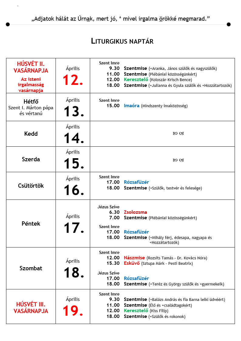 Heti liturgikus rend a felvett szentmiseszándékok feltüntetésével